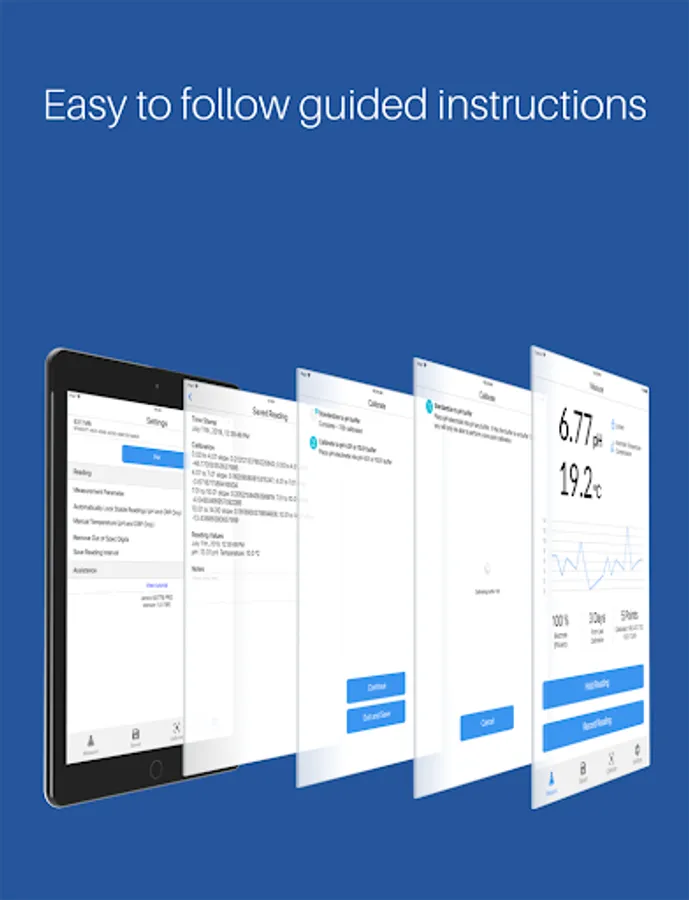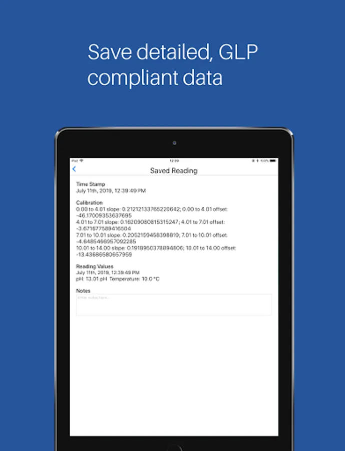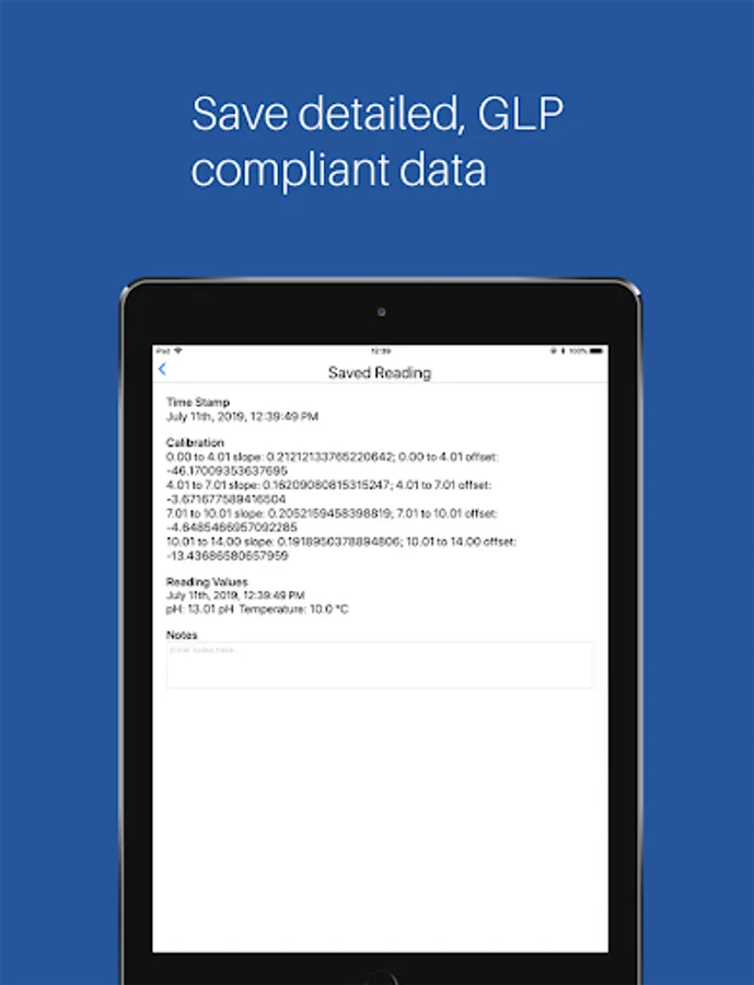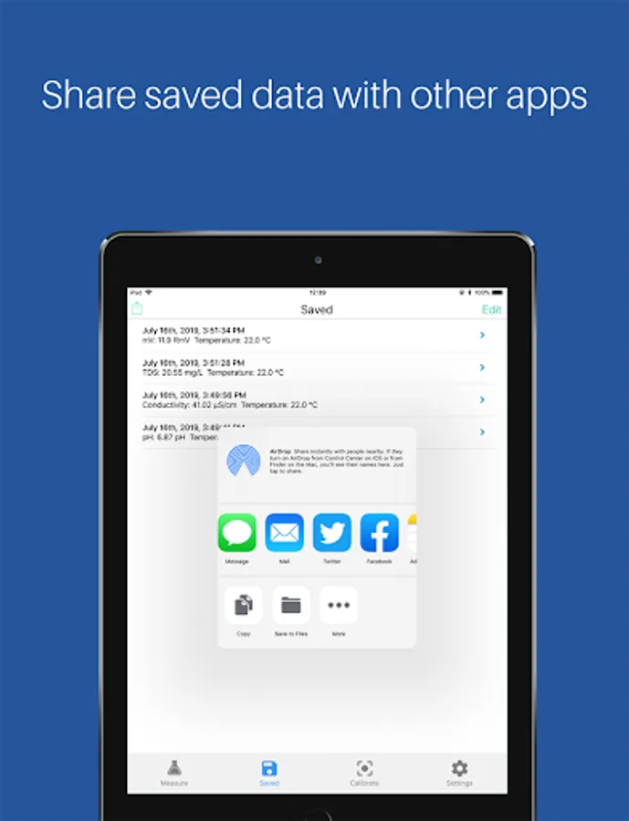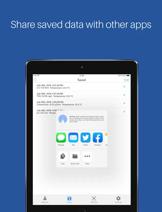 Transfer 750 saved measurement data from meter to app for sharing and further analysis. Measurement data includes pH, ORP or EC and temperature values and calibration information.