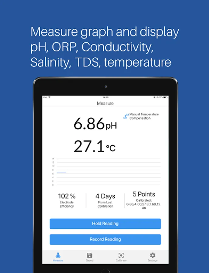 Display pH, conductivity, salinity or TDS with temperature readings simultaneously with electrode efficiency, last calibration date and real-time graphing.