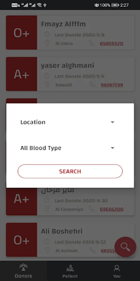 You can search for donors by province or blood type