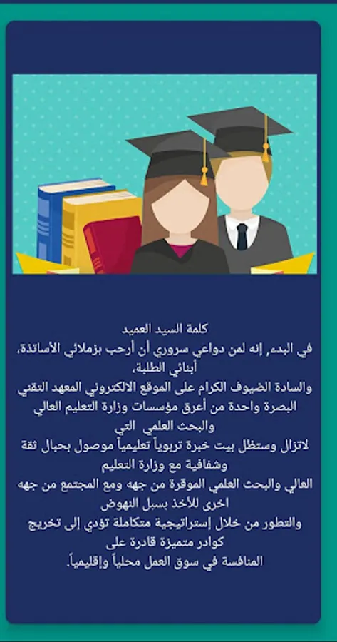 A page will be dedicated on the technical institute’s site, Basra. It will display distinguished student activities. Our institute has the advantage of developing students ’abilities in practice in the various workshops of the institute. These distinguished works will be displayed on a separate page on our website.