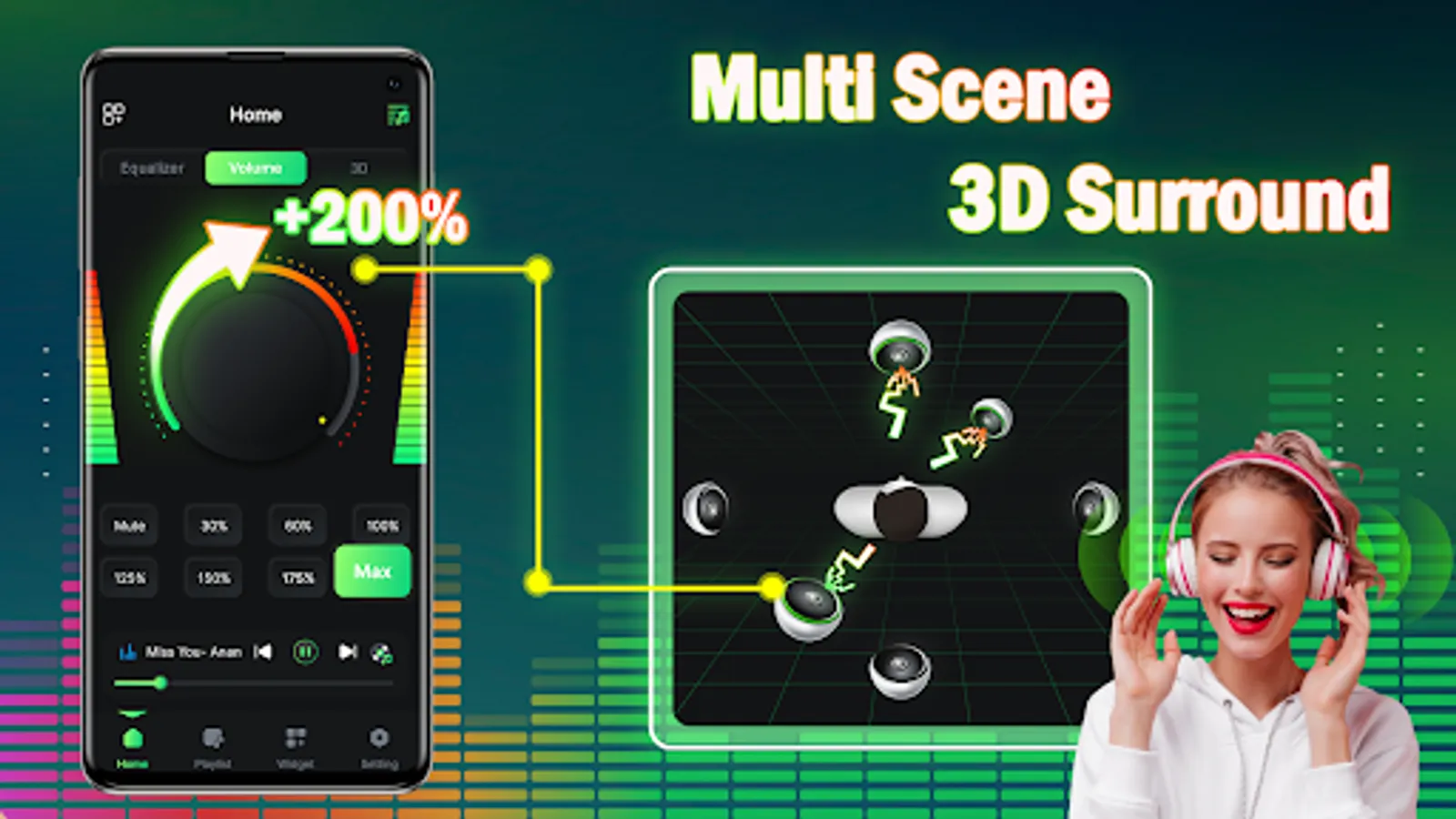 The amp uses high-quality 3D sound technology to deliver the most realistic music experience. Increase bass. It extracts spatial cues from your music to display them in crystal-clear 3D for an immersive listening experience. booster speaker. The sound booster equalizer uses reverb to create a 3D sound-like sound.
