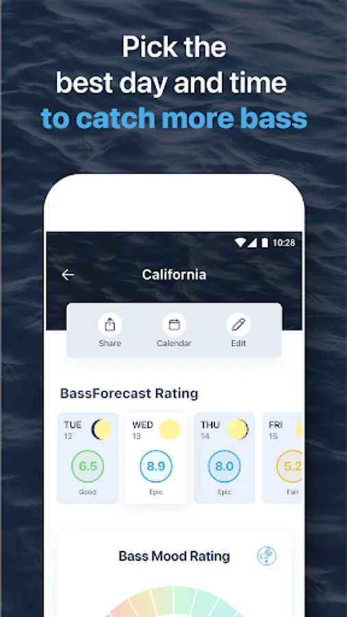• 10 Days in advance BassForecast Ratings so you can pick the best days (and times) to Bass fish