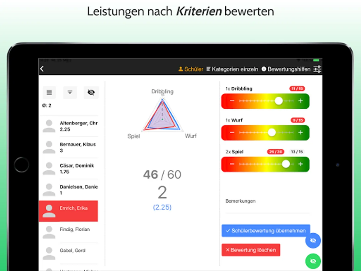 Tired of the hard work to get all the marks for every pupil? SportZens helps ypu with easy preconfigured schemes. You can even get your pupils self-evaluation and then compare it with your grading.