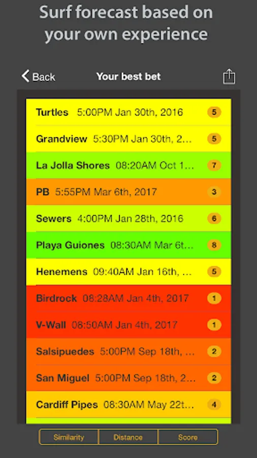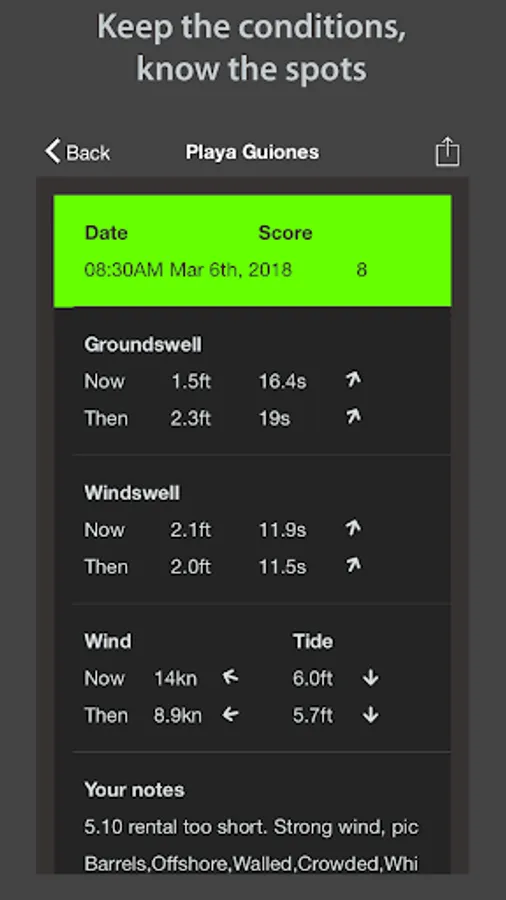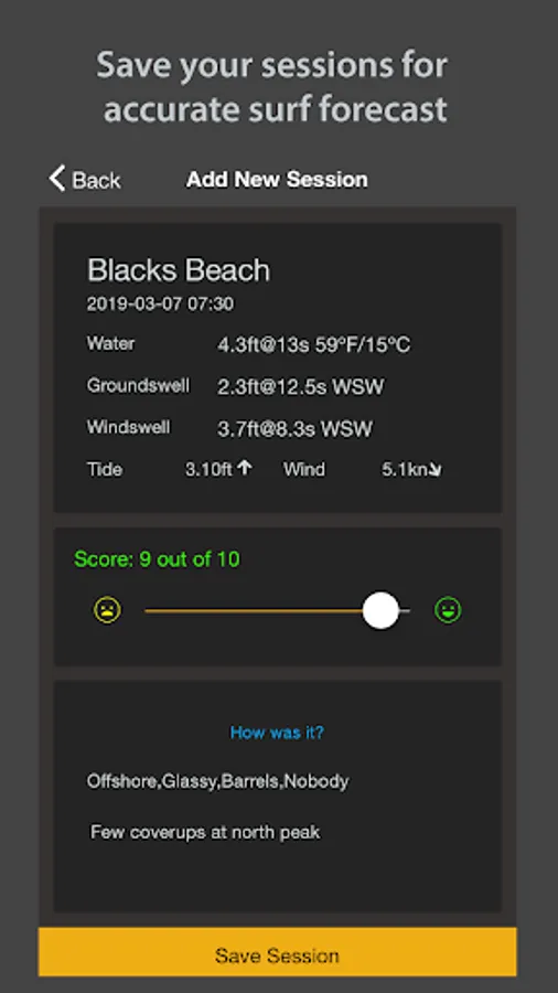 Rate and track your sessions and grow your personal surf journal. Sessions keep track of the current wave data, local tide and wind.