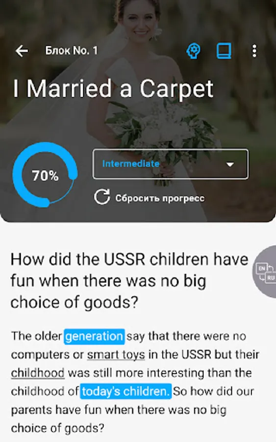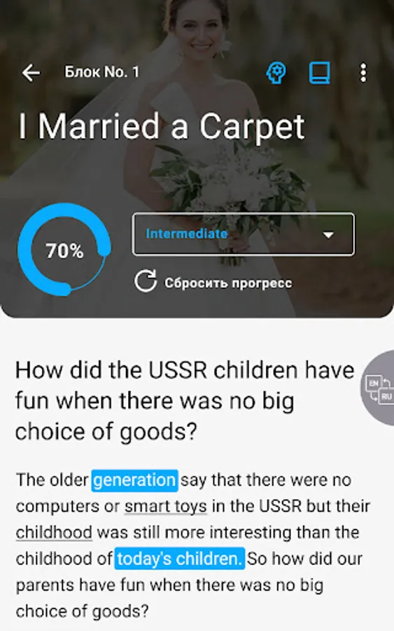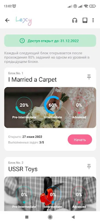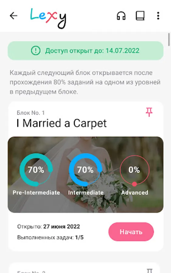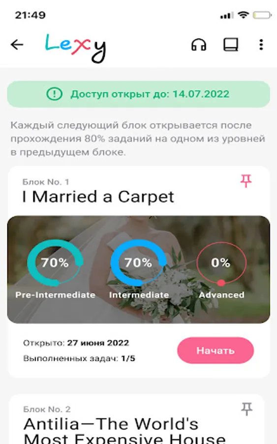The platform contains lots of units with study materials. Each unit consists of a text with an interesting topic, exercises, the voiceover of texts and active vocabulary.