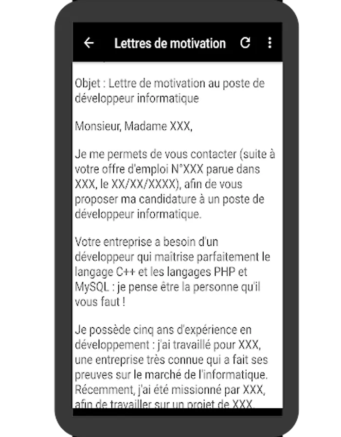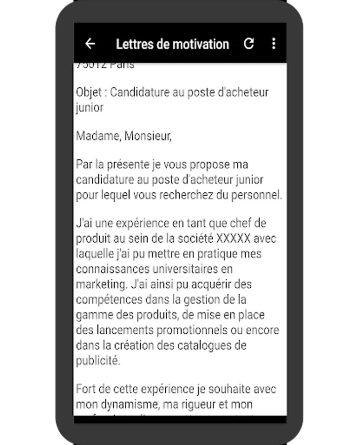 French cover letters Letter templates suitable for all situations. You will never find the cover letter corresponding exactly to your search since by definition a cover letter is personal and responds to a specific request. Without internet and contains more than 40 models for a job / Internship / License / Master / student job and spontaneous application and Among the examples for a job application: