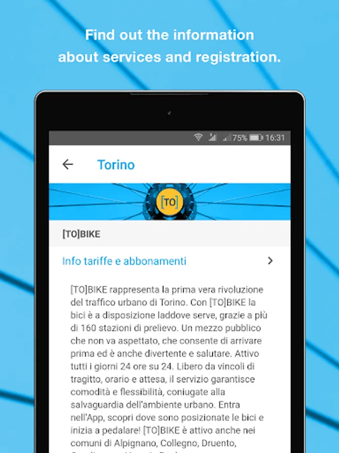 BicinCittà is the most popular bike sharing system in Italy. Ride with us in more of 100 cities, including Torino, Padova, Pisa, Como, Treviso, Bergamo, Parma, Rimini; our bikes, parked in strategic points, are available 365 days a year, 24h, and allow you to experience the city in a fast, fun and above all economic way.