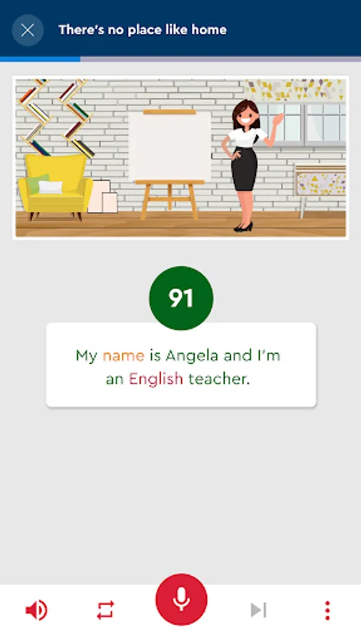 The student studies English actively. Through an advanced voice recognition system, the student speaks English from the first unit and compares his pronunciation with the speech of more than 100 natives from different locations.