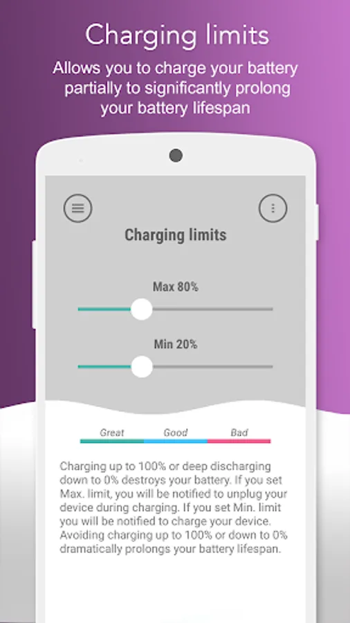 “Min. limit“ you will be notified to charge your device. Avoiding charging up to 100% or
