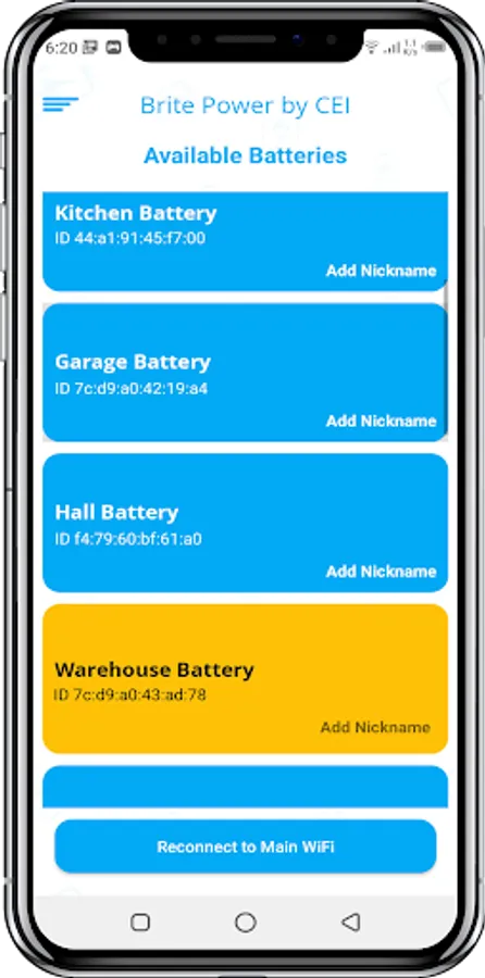 This app searches for nearby batteries (via their dedicated WiFi networks), allowing you to connect to your battery by selecting it from the list. Clicking on a blue button will take you to your Android device’s WiFi Settings, where you can connect to the battery's WiFi in the same way that you connect to normal WiFi. After connecting, come back to the app - you should now see the connected battery's button in yellow, indicating that your mobile device is connected to that battery. Clicking on the yellow button will take you to the battery interface screen, which displays your battery’s voltage, current, and state of charge, and allows you to put the battery into charge or discharge mode.