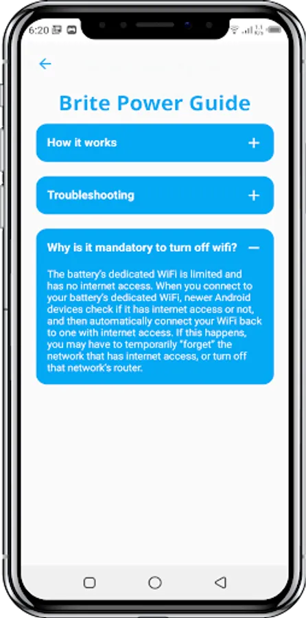 The battery’s dedicated WiFi is limited and has no internet access. When you connect to your battery’s dedicated WiFi, newer Android devices check if it has internet access or not, and then automatically connect your WiFi back to one with internet access. If this happens, you may have to temporarily “forget” the network that has internet access, or turn off that network’s router.