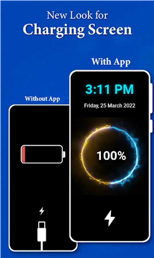 Using Battery Charging Animation Free App, discover a vast variety of battery charging themes and styles. From futuristic and amazing Charging Wallpapers to abstract designs, our Charging Play app has it all. Choose the Best Charging Animation App that matches your style and makes your charging time experience truly unique.