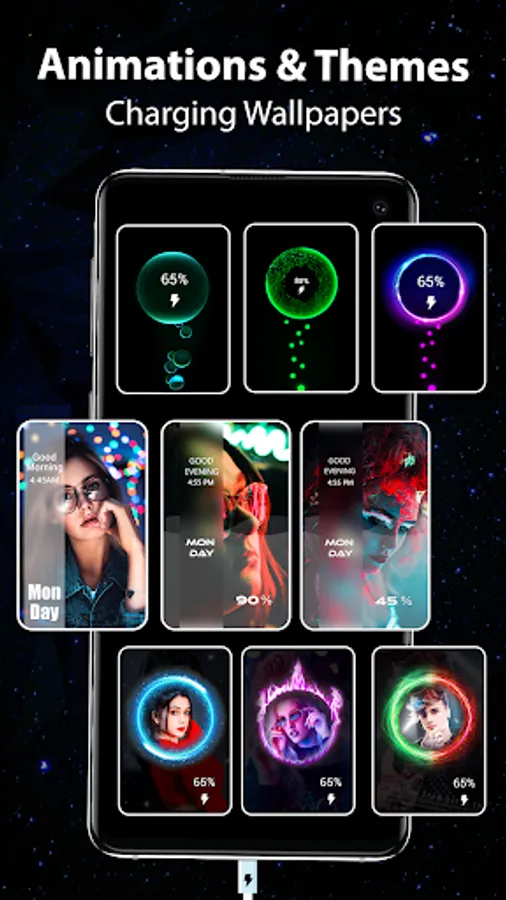 You can make your charging experience unique by using this charging animation theme app that allows you to choose different themes for the charging animation lock screen. These charging animation themes can be customized to your liking. Pick from a variety of bright colors, patterns, and designs to match your personal style and how you're feeling. Say bye to the boring and still charging screens and say hi to a bunch of cool charging animations and wallpapers that will make you excited with modern battery charging animations show..