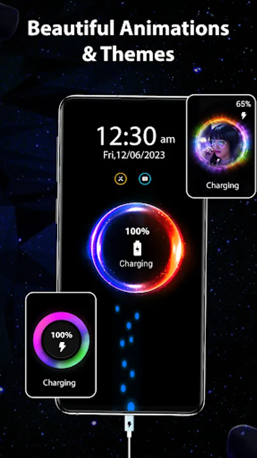 Make sure you know that your phone is charging. When you plug it in to charge, the screen on your phone turns on and shows colorful Charging Animations. Battery Live Charging Animation app have different cool effects that show while the phone is charging. When you plug in your phone, the screen turns into a colorful charging animation.