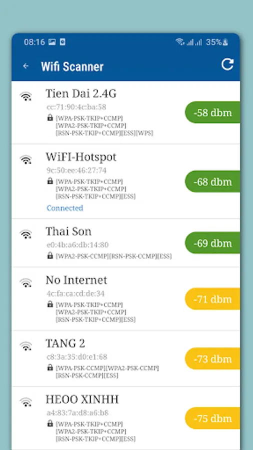 - Scan Wi-Fi networks and analyze nearby WiFi networks, evaluate the level of good, average, and poor signal. Scans all devices connecting to your wifi to tell you: how many connections are connecting to your wifi, and you know "Who is connecting to your wifi?".