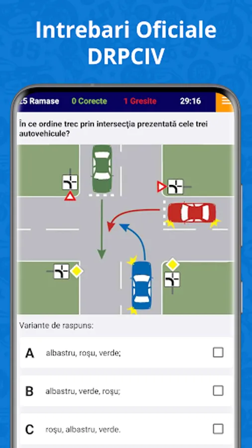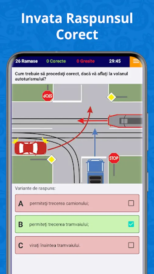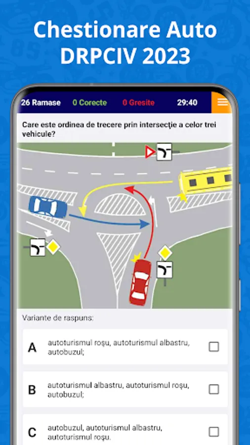 Car quiz 2023 from A to Z for category B. This includes the official DRPCIV questions like go to the gym and we also made the app design look like the format official.
