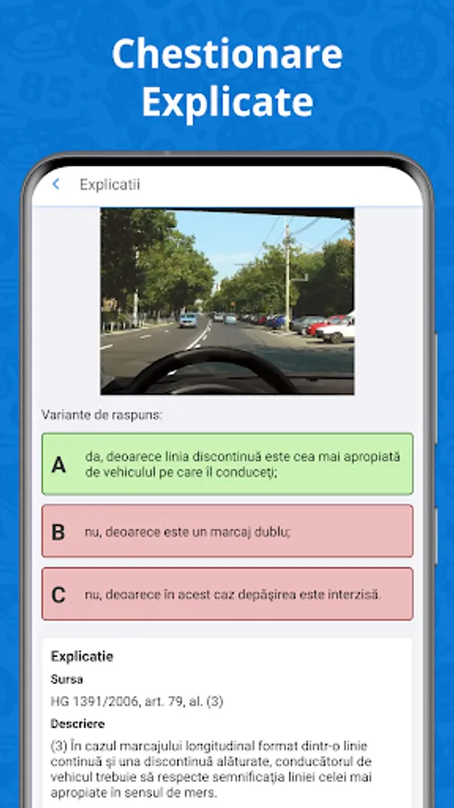 Also, in order to cover the needs of all students from any driving school in Romania, we have added a section in our application where you can test your knowledge about category E (BE, CE, DE, B1E, C1E, D1E, B96). At the same time, we prepared dprciv questionnaires for the reacquisition of a driver's license, to extend a helping hand to all drivers who wish to reacquire their driver's license.