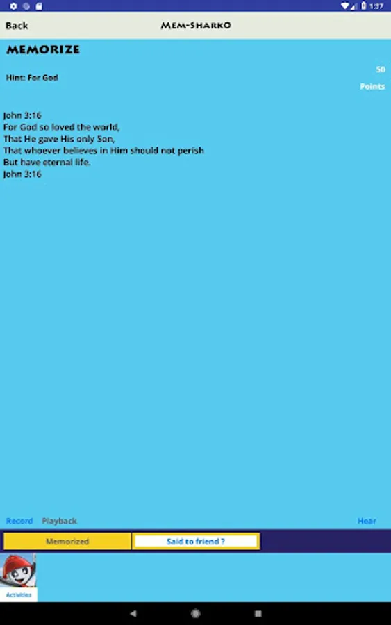 Parents and children will love memorizing verses in this Bible memory app that coordinates with the Awana Sparks HangGlider program. Includes all the Awana songs. Kids love the audio recording capability. Children can see, hear, record, sing and say verses and play several different activities to help them commit verses to memory. Tracks memory and review status for multiple participants and gives points for their memory/review activity. As reward, participants pick animals to "help Noah load the ark" and hear the animal sounds. You can search “BattleGearApps” or “Awana77” to find related apps.