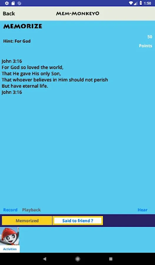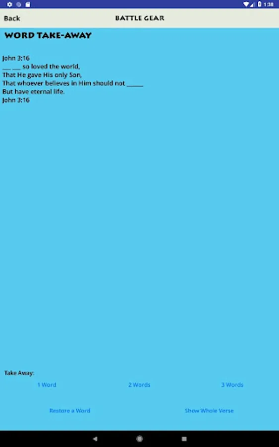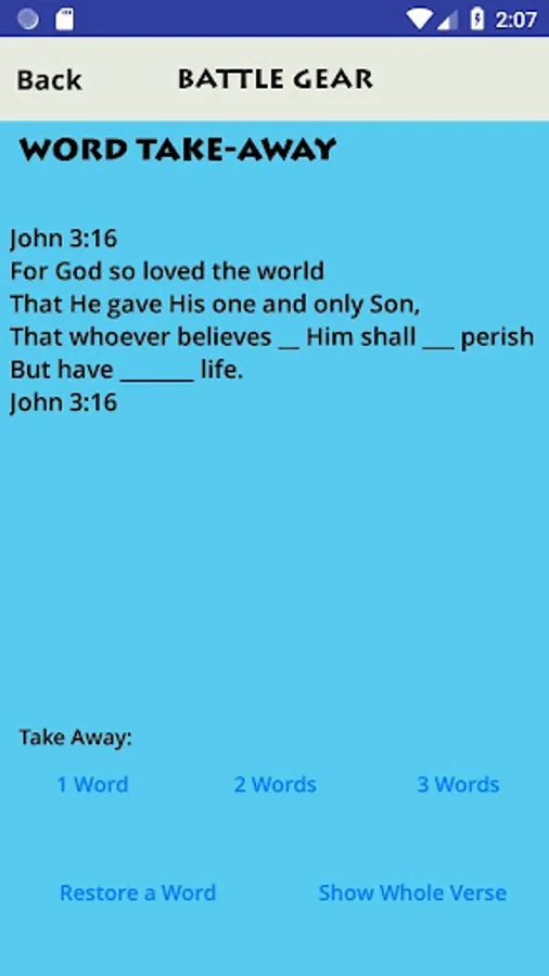- Try memory activities such as Phrase (show a phrase at a time), Word Take-Away, and Initials (show just the first letter of each word in the verse)