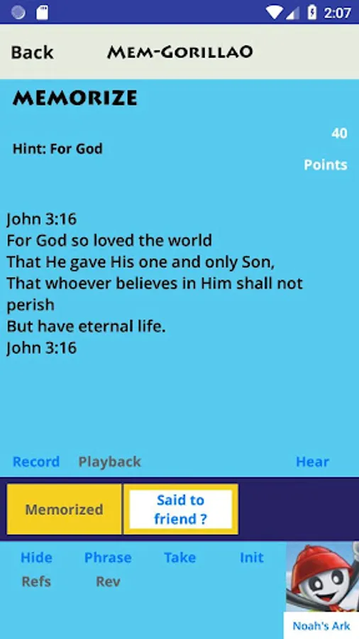 - Place animals in Noah’s ark as a reward for points earned in memory and review – hear the lion growl and the elephant trumpet!