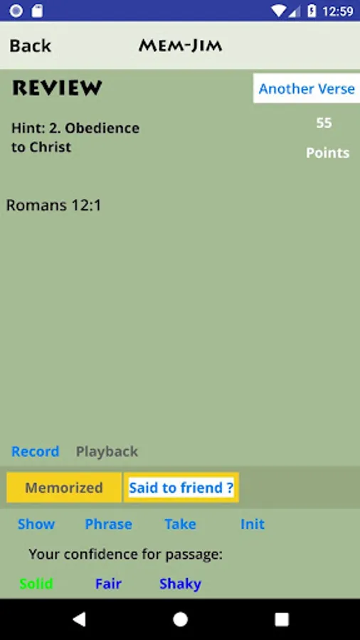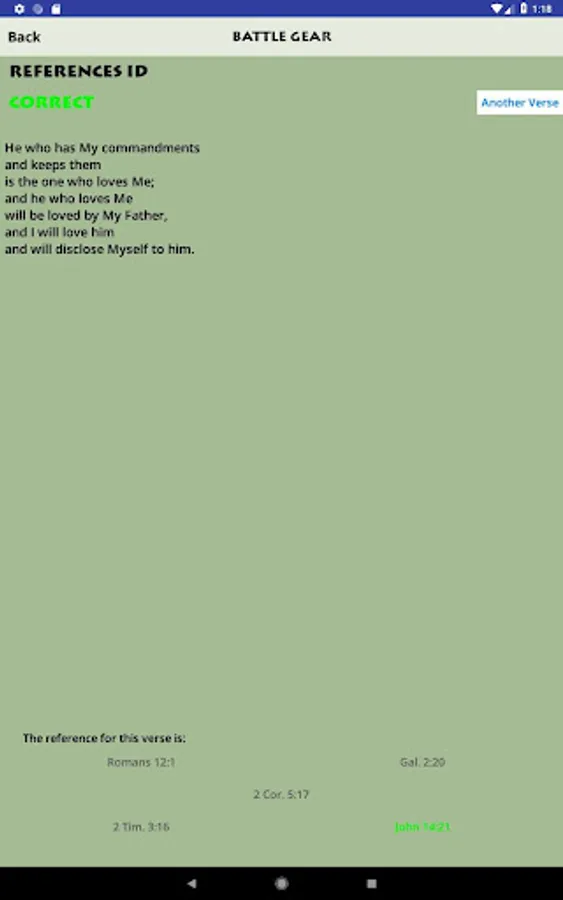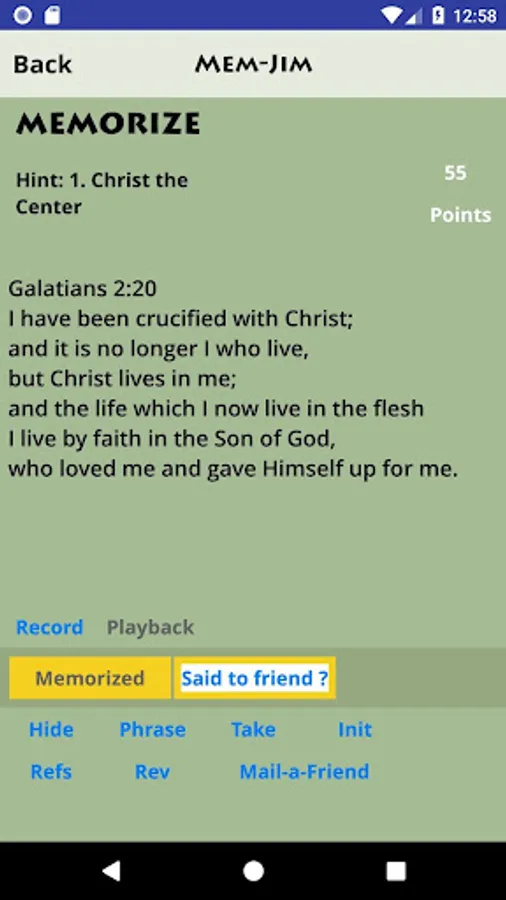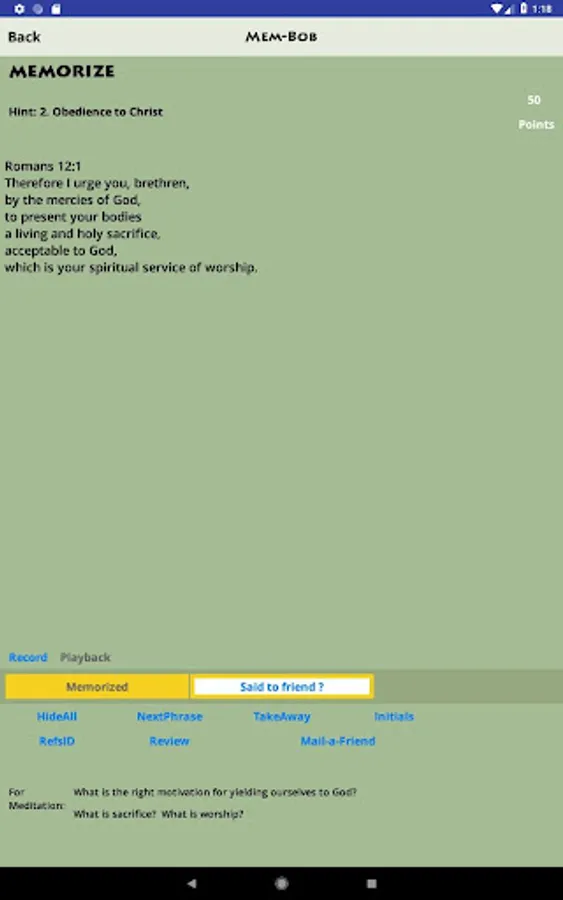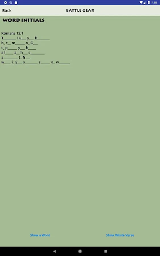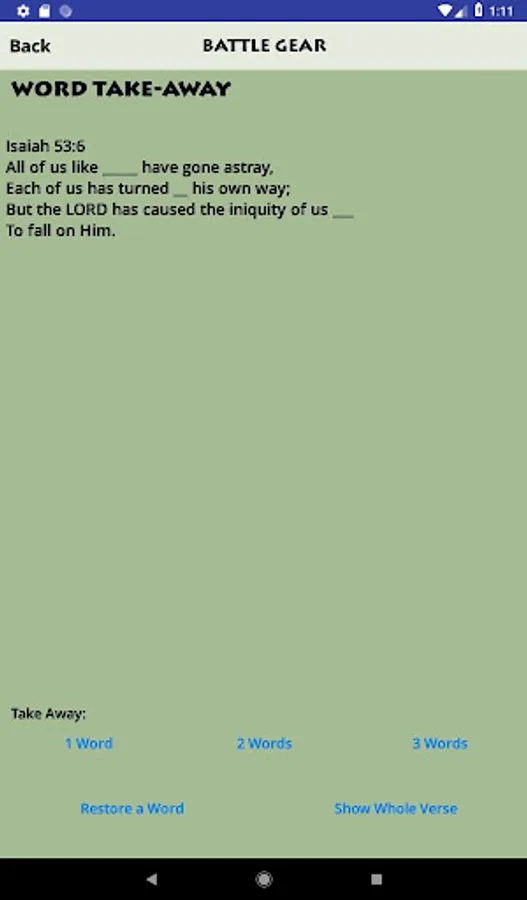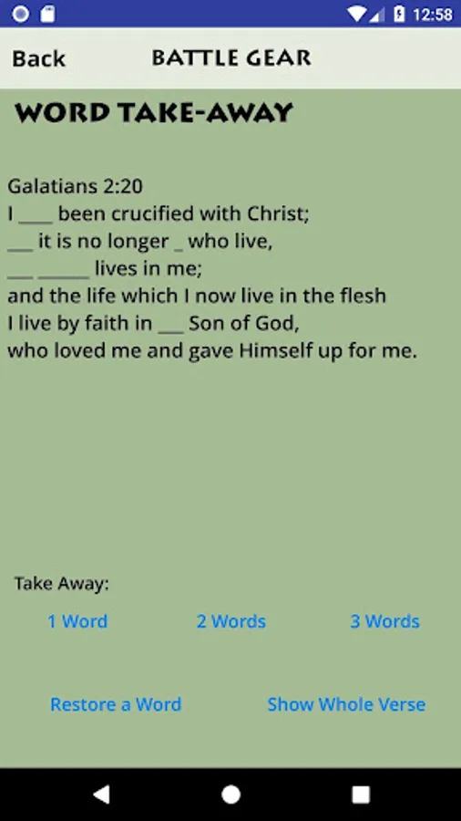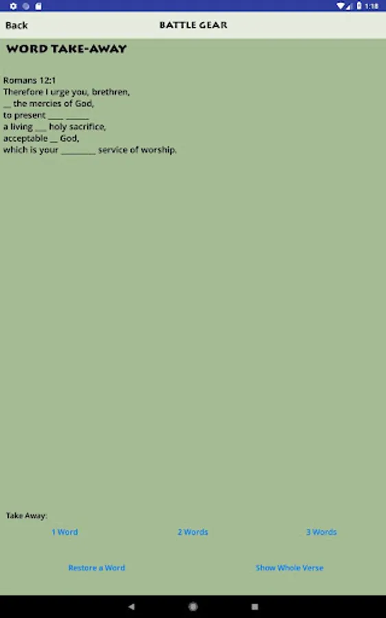 - Memory activities such as Phrases (show a phrase at a time), Word Take-Away, and Reference ID (gives the Scripture text and lets you choose the reference)