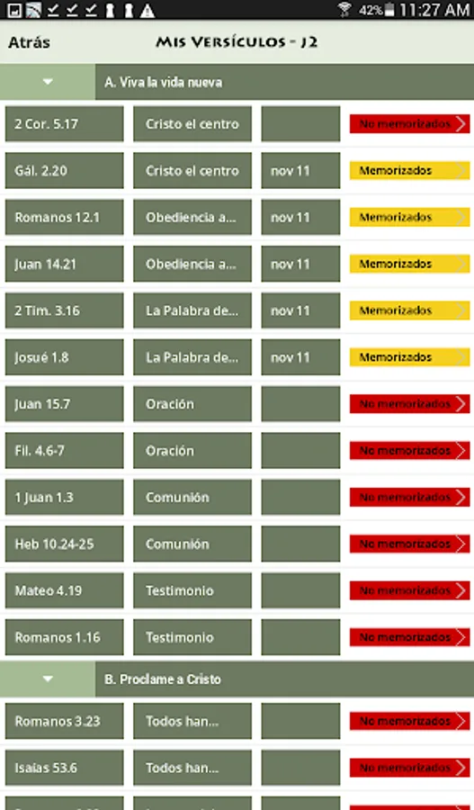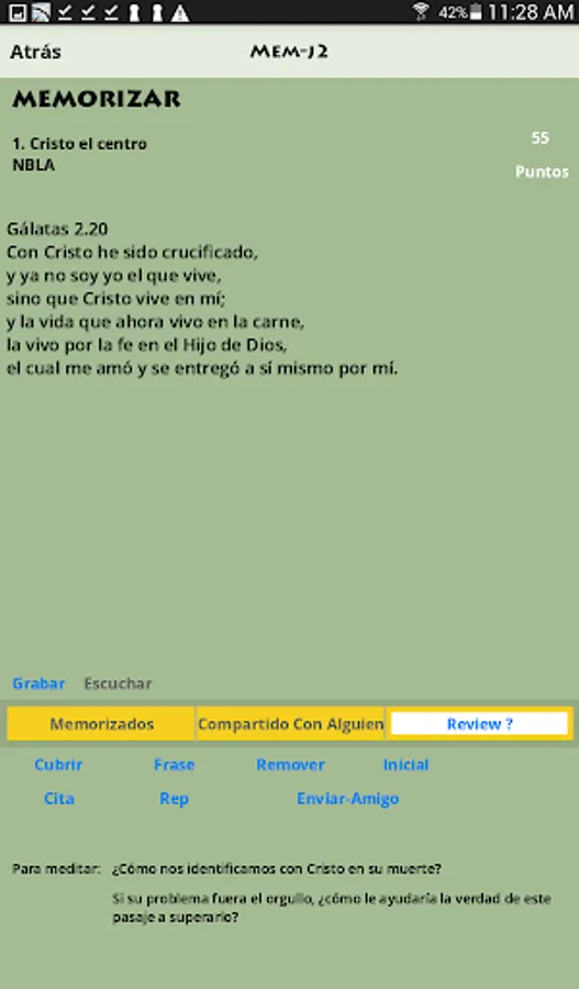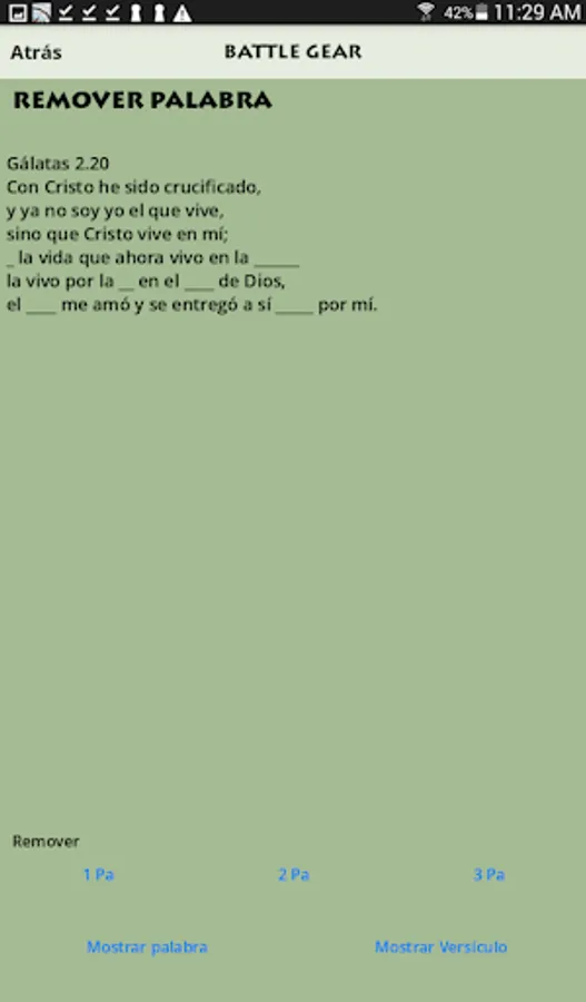 - Memory games like "Phrases" shows you one phrase at a time, "Remove" removes one word at a time and "Quote" gives you the verse and allows you to choose the reference.