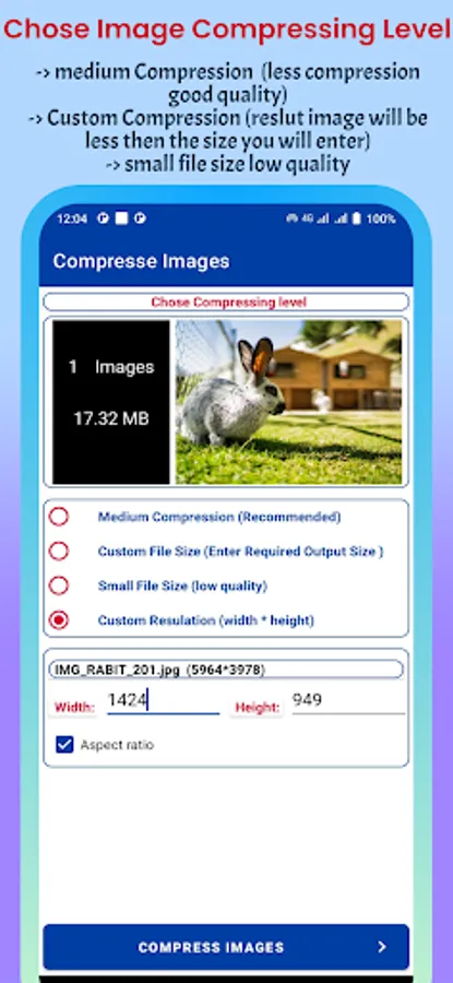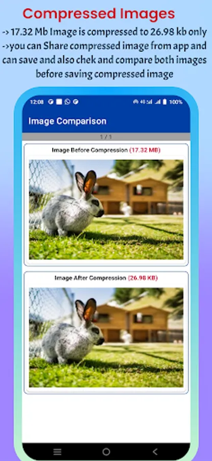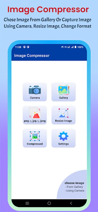 The Image Compressor is a feature-rich app designed to provide users with a variety of tools to compress, convert and resize images. With a user-friendly interface, the app makes it easy to choose an image from your gallery or capture a new one using your camera. Additionally, users can directly share images from their gallery to the app.