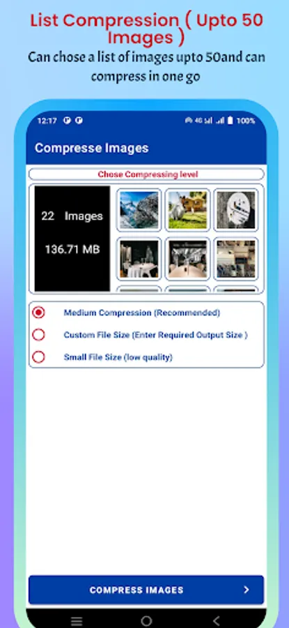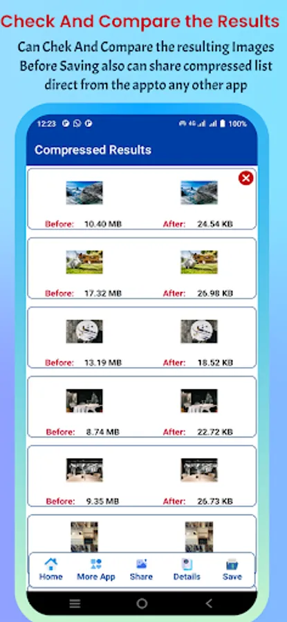 The app also includes a list compressing feature that can handle up to 50 images at a time, making it easy to compress multiple images at once. Users can also convert image formats between JPG, Png, and Webp, depending on their needs.