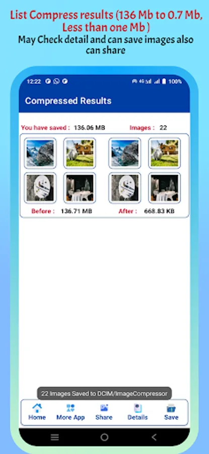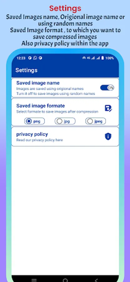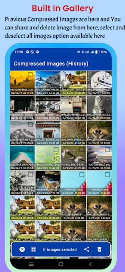 The app includes a built-in gallery, where users can view their previously compressed images and perform various actions such as sharing or deleting. The settings menu allows users to customize their image format and saved image name to suit their preferences.