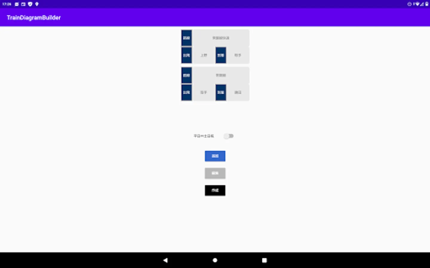 追加ボタンより路線名と出発駅・到着駅を指定できます。編集ボタンより追加した区間を選んで削除することができます。平日・土休日ダイヤの切り替えはトグルスイッチによって行えます。作成ボタンよりダイヤグラムの表示ができます。