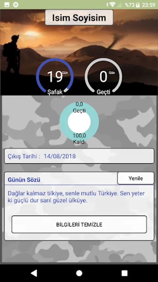 Military Service Dawn Sayar application with make countdown until you will be demobilized by entering the delivery date of your union days, he said the okuyabilirsiniz.bedell the sunulmuştur.bedell the military engaged citizens to the use of citizens involved in military service of the day will be able to perform the dawn counts of Android devices.
