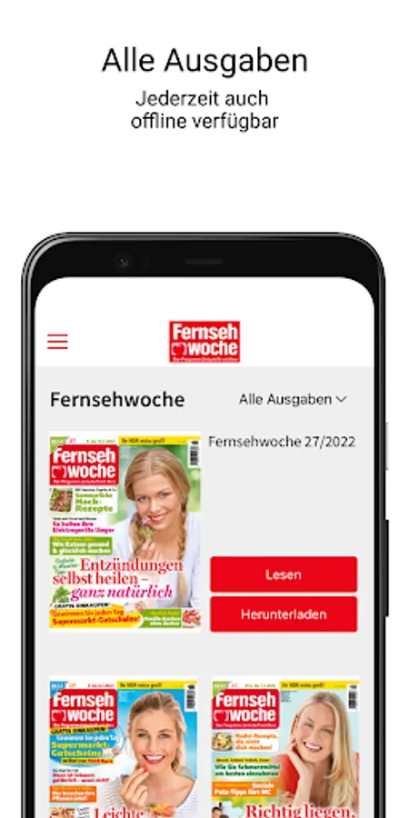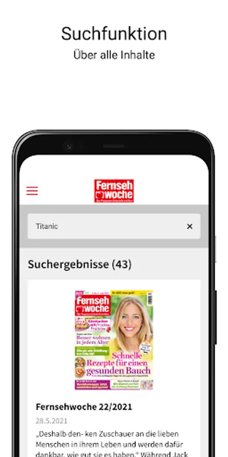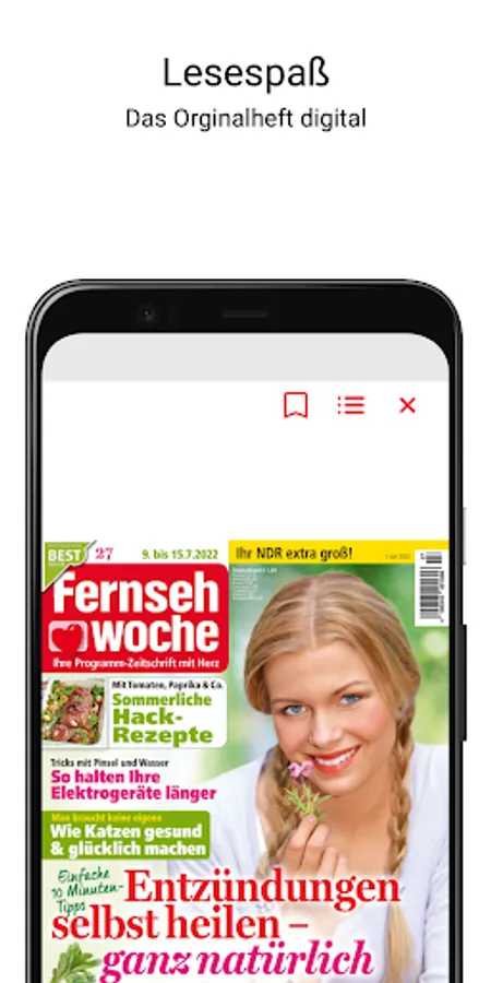 Have a high-quality TV program with an exciting advice section with you on the go? That's not a problem: With the TV magazine TV week app, you can access your magazines from anywhere. With the digital subscription, you can easily read your magazine on your cell phone on the bus and train and always have the current issue with you. The great mix of topics offers new, exciting news and tips in areas of life for the whole family every week! In addition to exclusive interviews with the stars, the television week contains an overview of all the highlights of the program week and gives daily feature film tips. Subscribe now and never miss an issue again. With the practical search and bookmark function, the app is the perfect companion for every day!