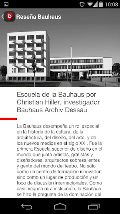 BauhausStgo is an application developed by the National Museum of Fine Arts and the Goethe-Institut Chile and with the collaboration of the Bauhaus Dessau Foundation for smartphone and iPad, where you can view a selection of 30 buildings georeferenced manner in Santiago, as a contribution to the spread of this modern architectural heritage. Interact select your favorite buildings and share them on Facebook and Twitter.