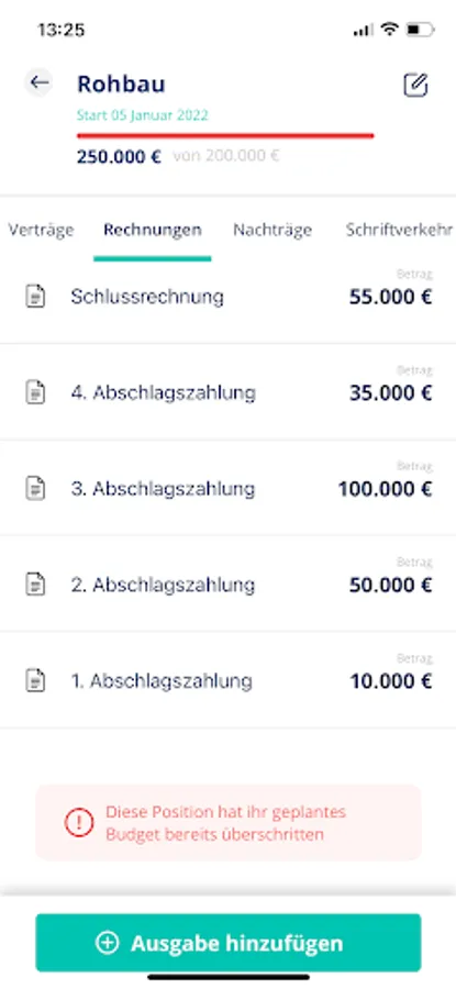 3. Behalte immer alle DOKUMENTE im Blick. Du kannst zu allen Kostenpositionen die entsprechenden Verträge, Rechnungen, Nachträge und den Schriftverkehr hochladen.