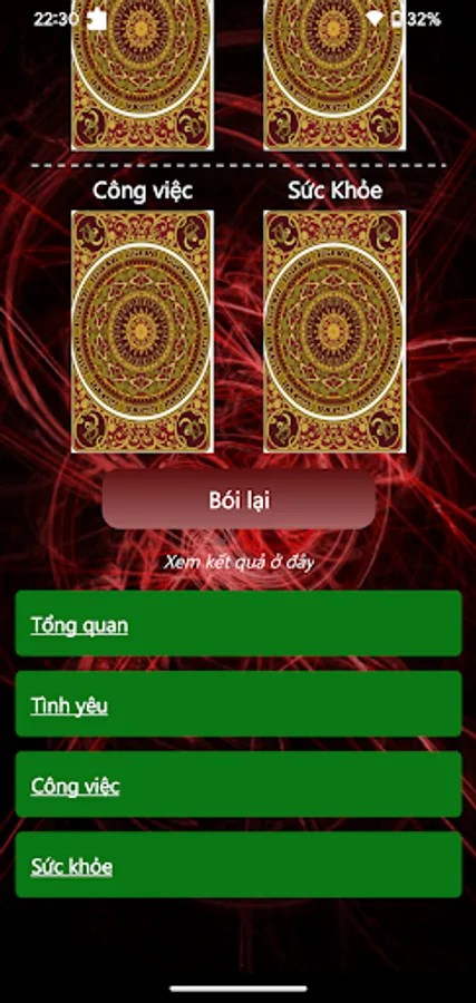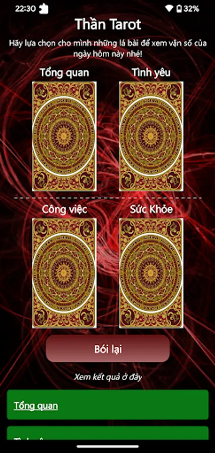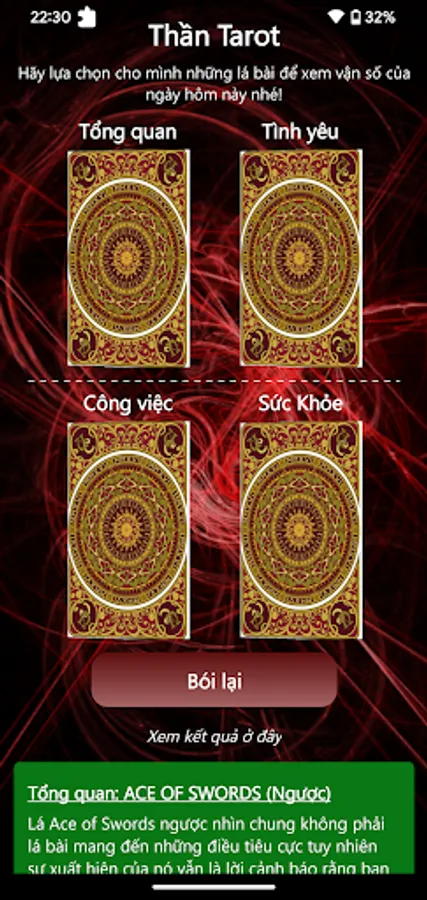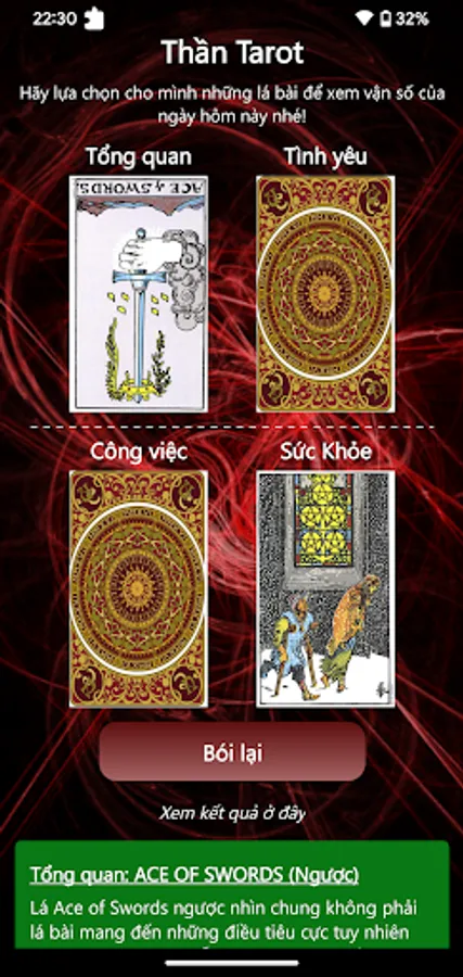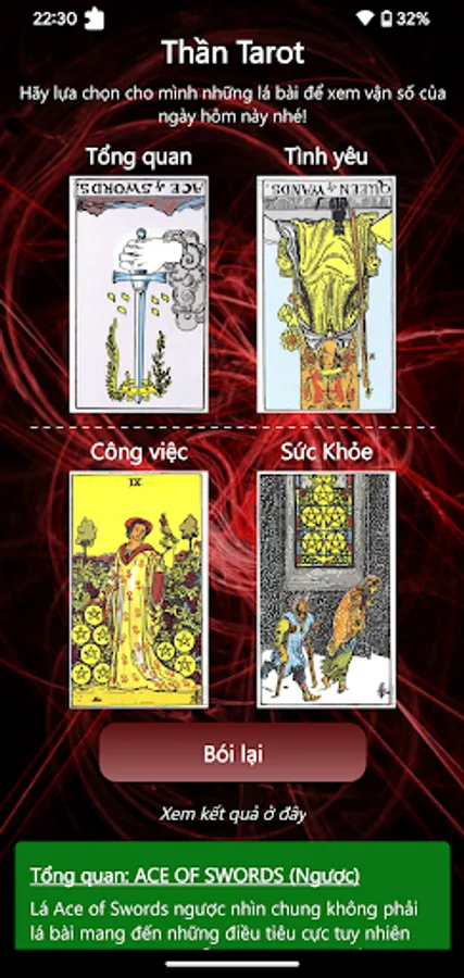 And thousands of miracles are waiting for you to discover every day, each card, tarot card contains extremely mysterious astrological and palmistry meanings. Boi bai tarot will not let you down. If you are looking for answers for love, work, or health. Download the app and do your daily fortune telling. You can see many different issues every day, so please log in every day.