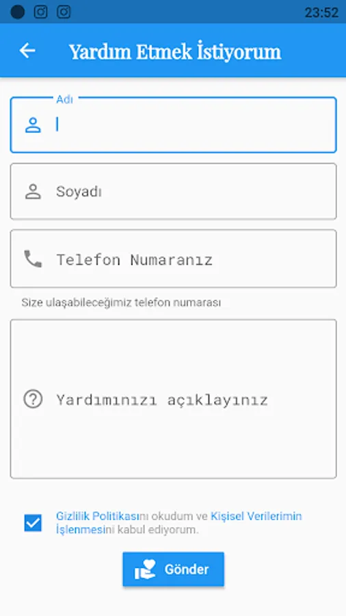 By using the I want to help button on the main screen of the application, we can contact you by sending us the help you will give to the association, the subject you want to help and contact information.
