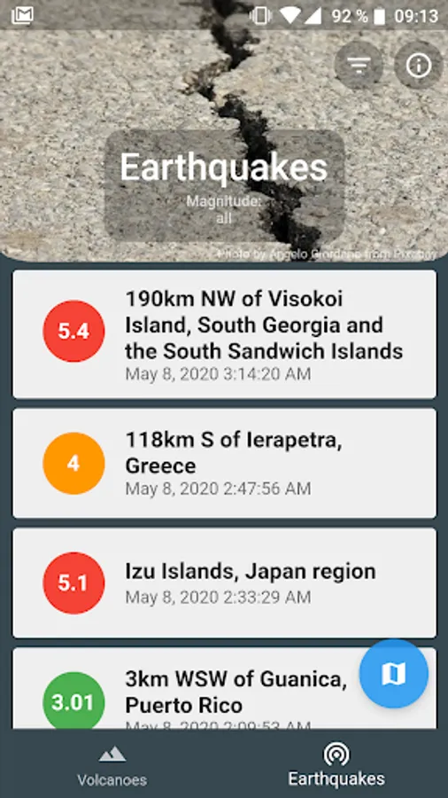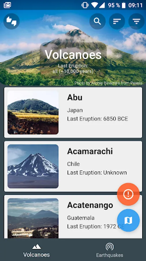 Find volcanoes and earthquakes worldwide - get detailed information about them and find them on the map.