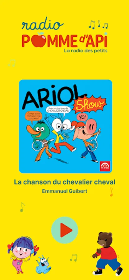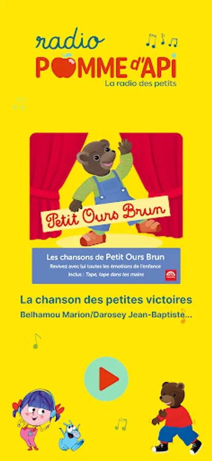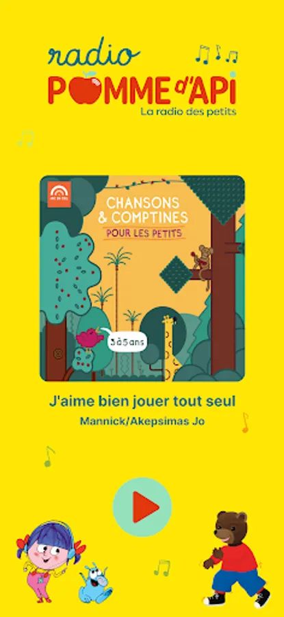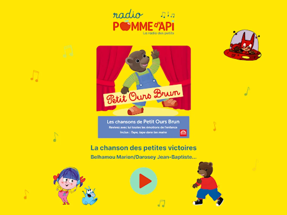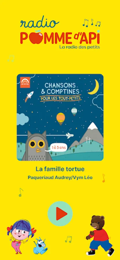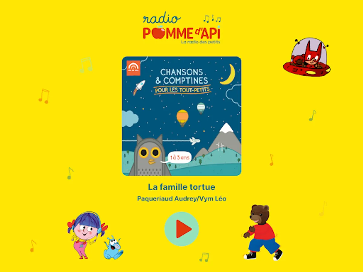 All day long, on Radio Pomme d'Api, songs, nursery rhymes, stories and poems, the best of sound creation for children: from Anne Sylvestre to Aldebert, from Henri Dés to Zut, nursery rhymes by Petit Ours Brun to the King of Dads, through classical music, jazz and world music, but also the great songs of the heritage, from Trenet to Stromae, De Brassens to Bobby Lapointe via the Beatles.
