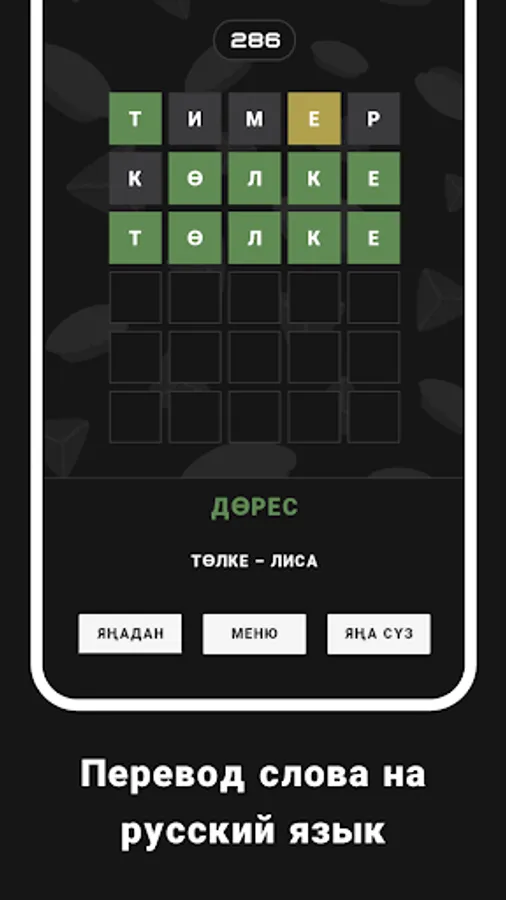 The popular game is now in Tatar! There are 300 words in the game, guess everything and fill in өchpochmak in the main menu. If the answer is correct, the translation of the word into Russian appears. Learn Tatar by guessing the words.