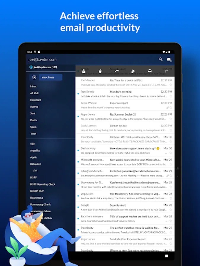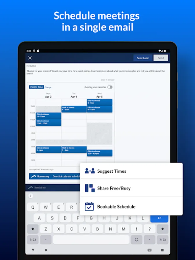 Meet Boomerang, the most powerful email client and meeting scheduling app for Android from the makers of Boomerang for Gmail and Boomerang for Outlook. Our app integrates with Gmail, Google Workspace, and Outlook accounts.
