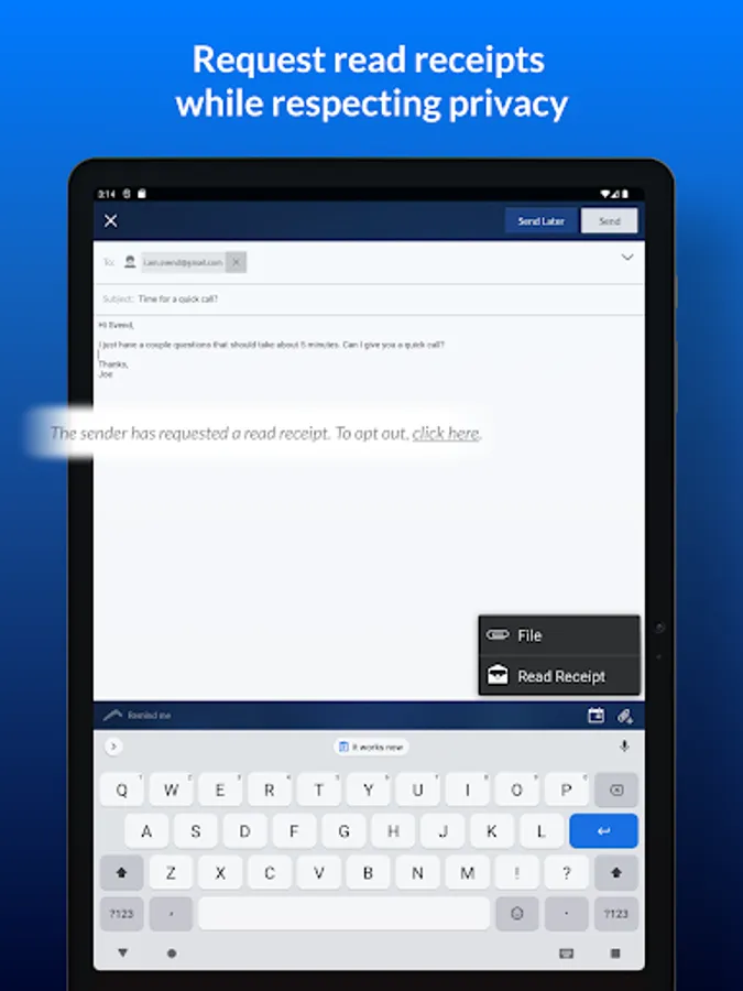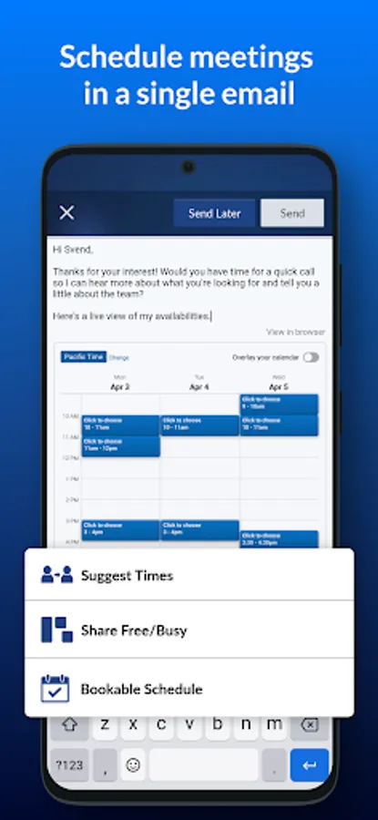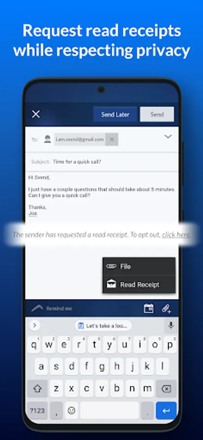 Featuring advanced functionality like meeting scheduling, snoozing emails, recurring email set up, scheduling email, response tracking, Inbox Pause, read receipts, advanced search with filters, and more. This is the email client and meeting scheduling app you've been dreaming about. These features, combined with an intuitive gesture system and eye-catching design, make Boomerang the best way to access Gmail and Outlook messages and schedule meetings and emails on your phone.