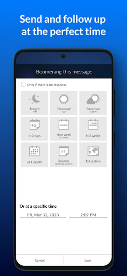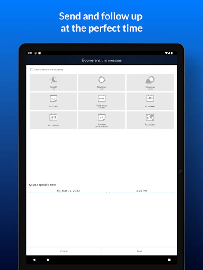 “Boomerang allows users to schedule messages to send at a predetermined date and time, or "boomerang" them back into their inbox if there's no reply or if a message requires follow-up.” -AndroidPolice.com