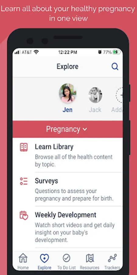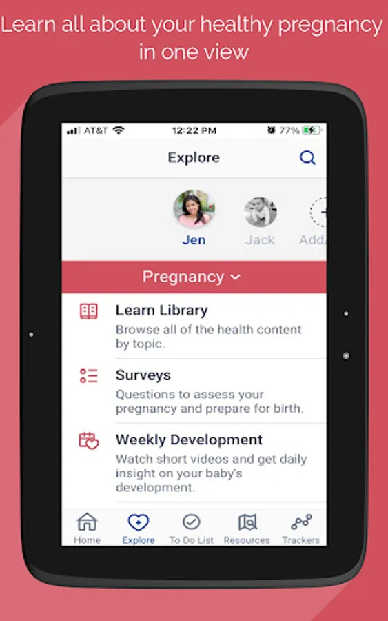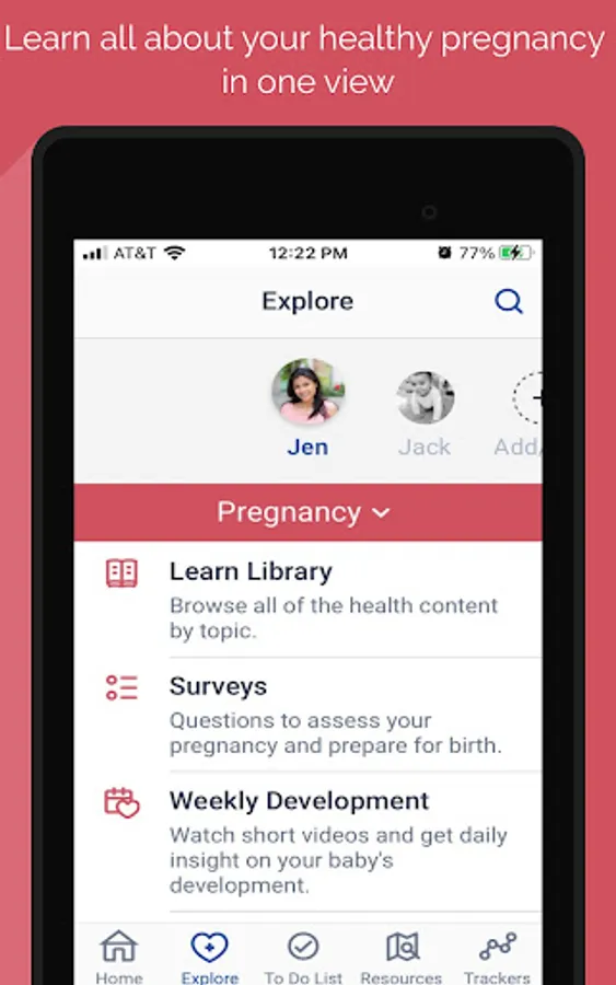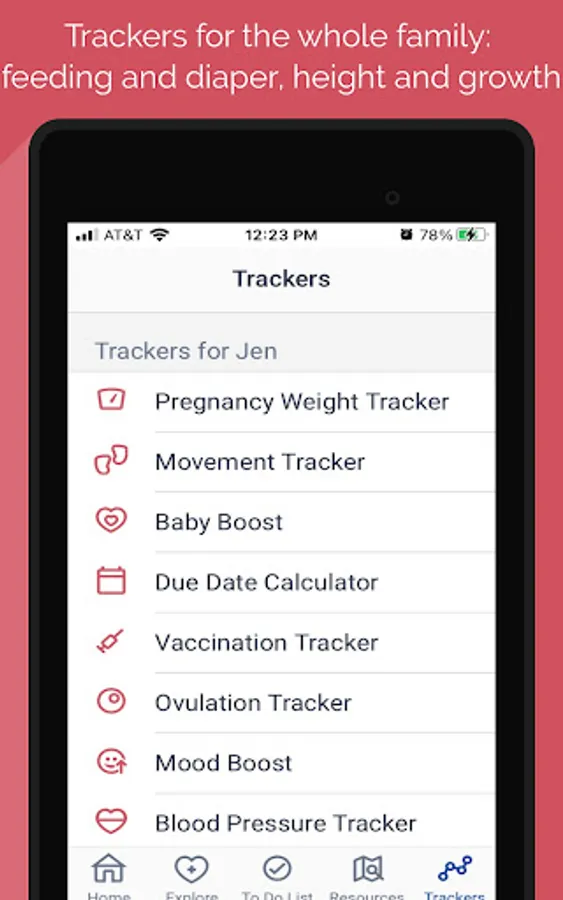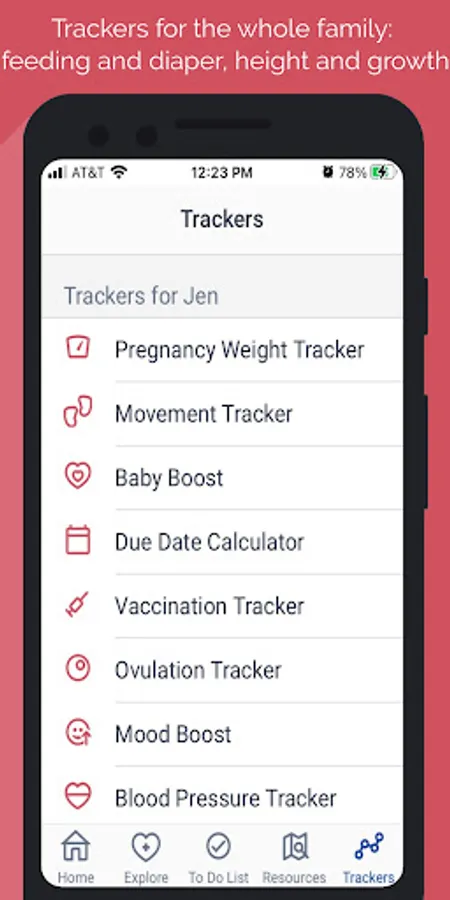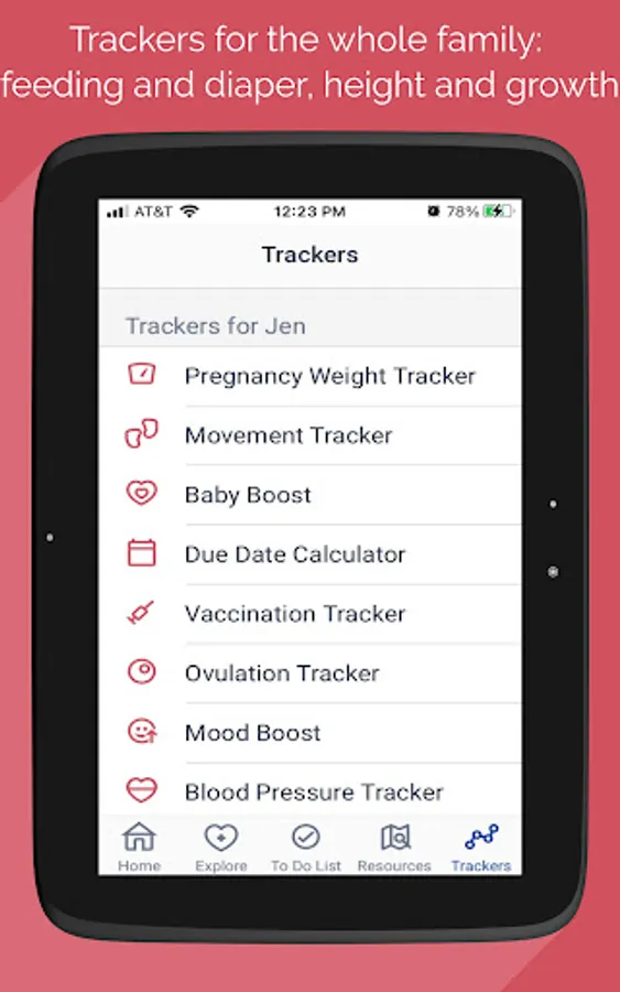 • Pregnancy trackers for baby’s kicks, your healthy weight gain and due date