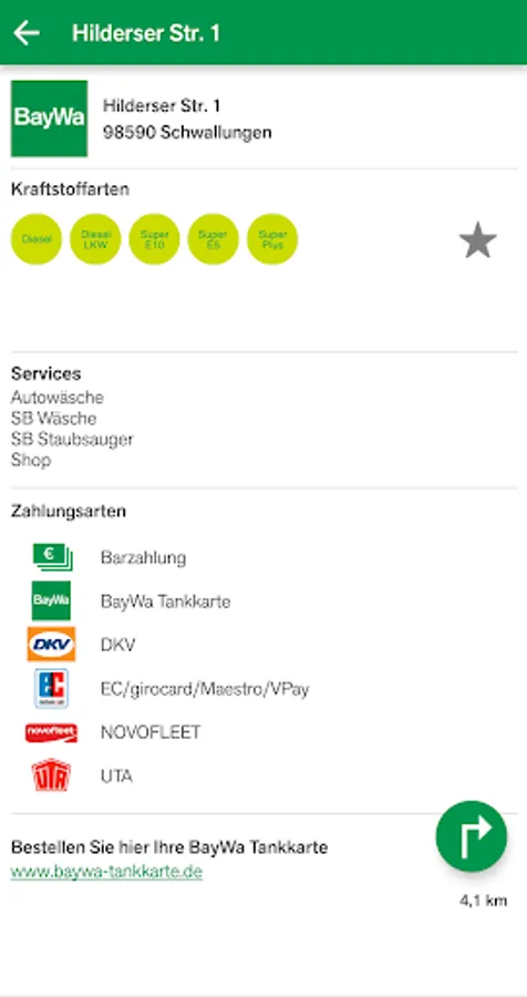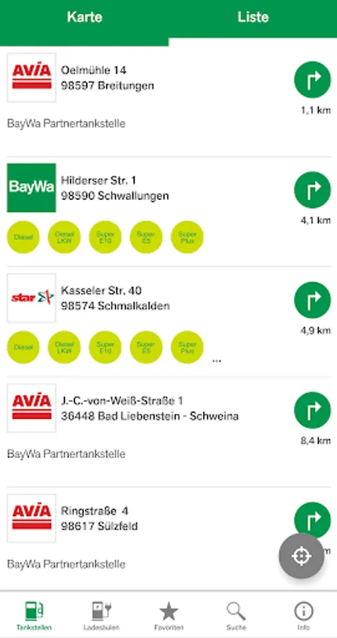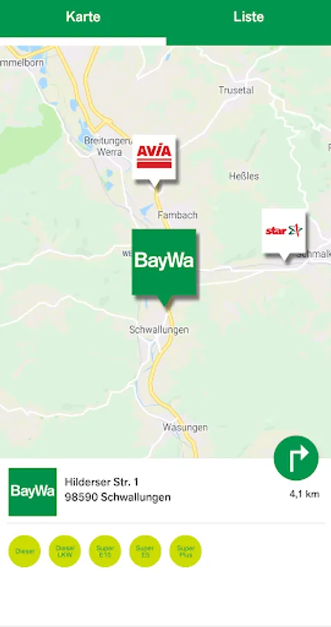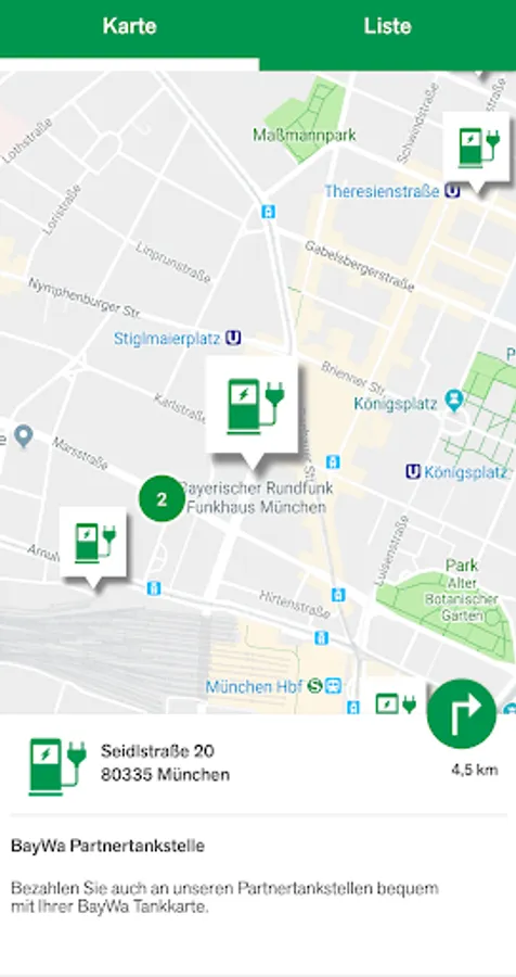 The refueling and charging app then guides you on the shortest / fastest route to the nearest BayWa or partner gas station or to the nearest charging station.