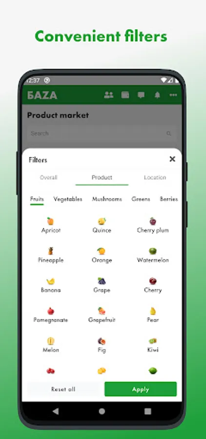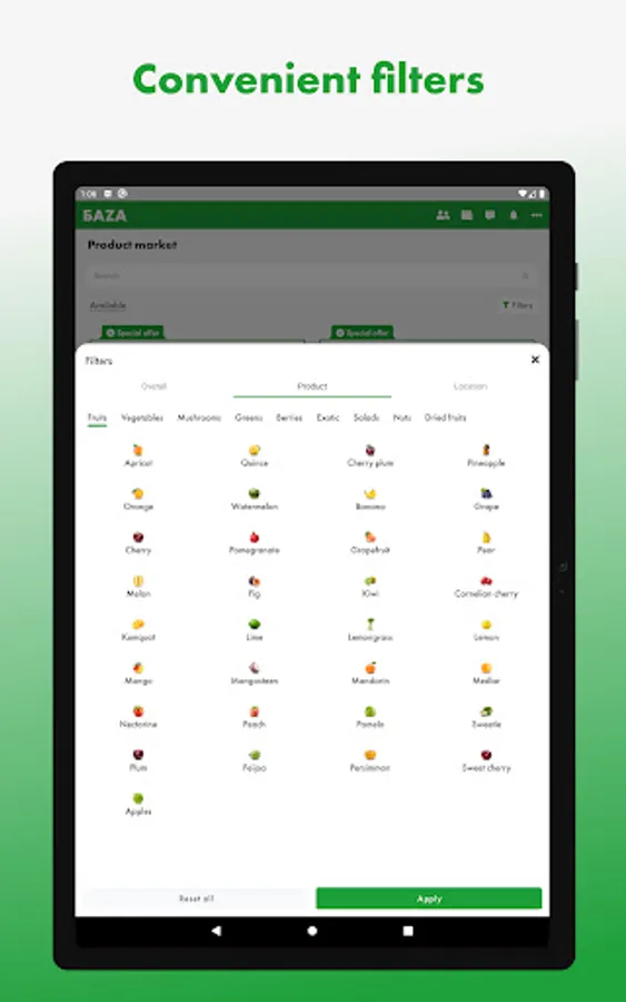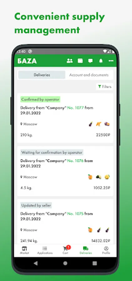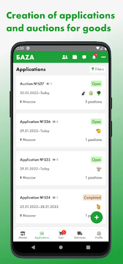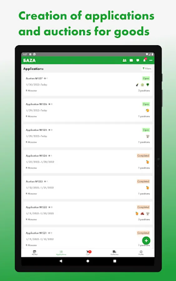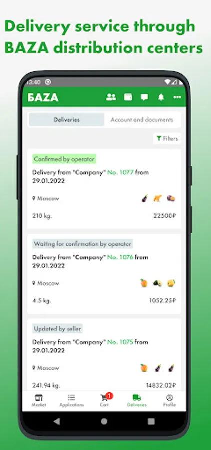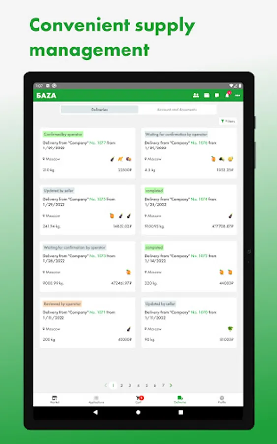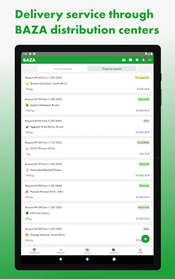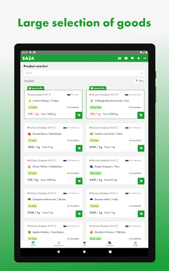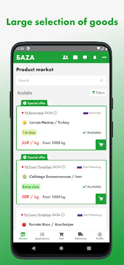 The first wholesale online market for fresh fruits and vegetables in Russia, where a lot of products from farmers and exporters is presented, ready for supply from BAZA Distribution Centers in Moscow and St. Petersburg cities.