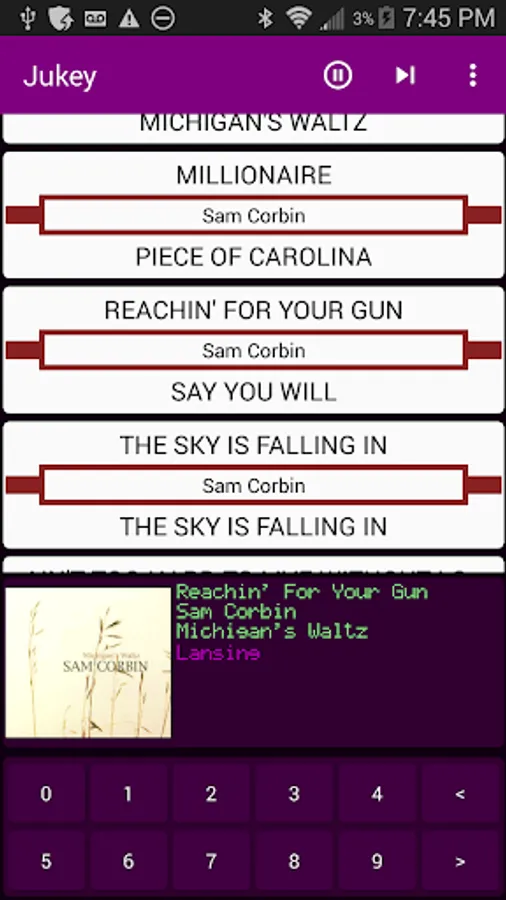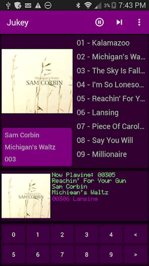 Jukey is a music player with a Jukebox interface. Browse your albums with the jukebox style buttons, or swipe actions. Select a song by tapping on the title or by entering the album index and song index with the on screen numbered buttons.