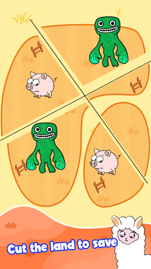 Welcome to the ultimate cut-to-save puzzle game, where your mission is to save the most adorable creatures! Use your brainpower and creativity to draw a limited number of straight lines that will cut the land and separate the weak from the evil.