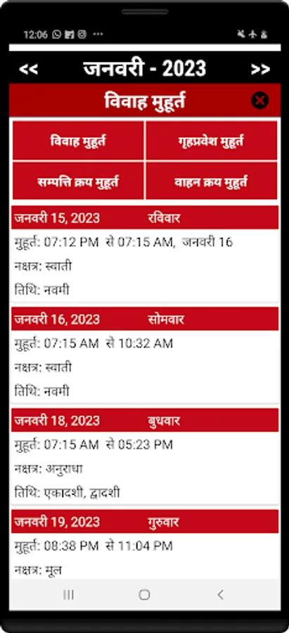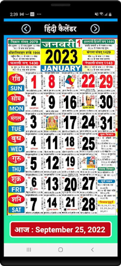 Hindi calendar 2023 app has high quality monthly images that allows you to view maasam, vaaram, thithi, and nakshatram information for all days in the year 2023 in Hindi.