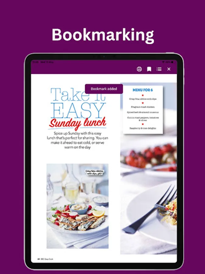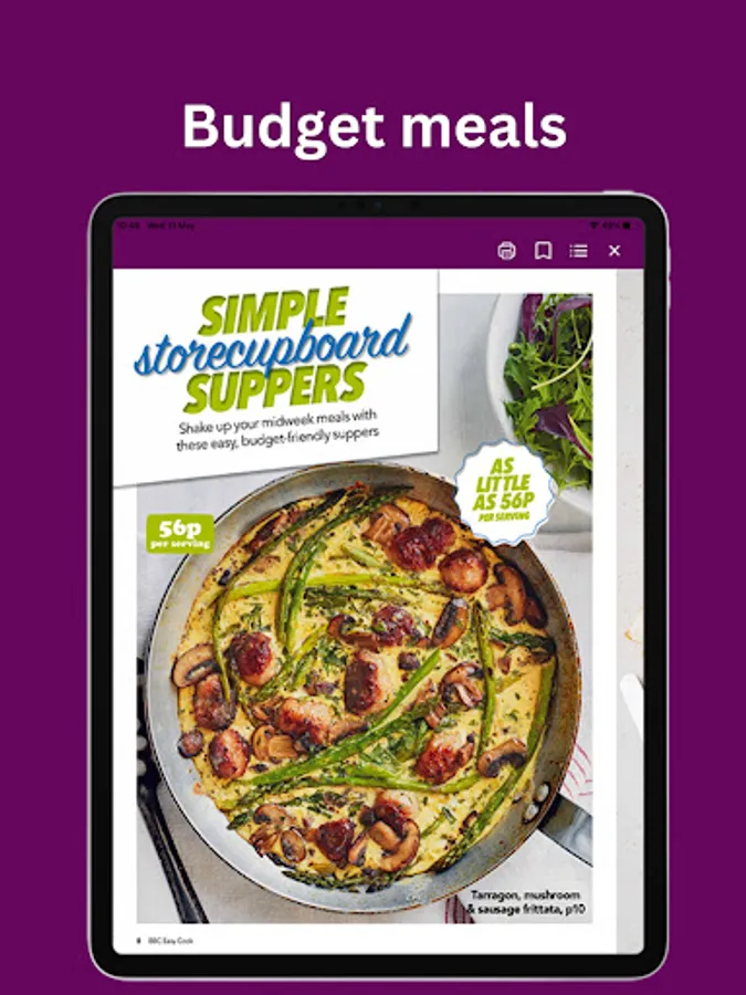 The magazine is divided into five distinct sections: Speedy Meals, Easy Entertaining, Get Baking, TV Cooks, and Easy Cook Cookery School.