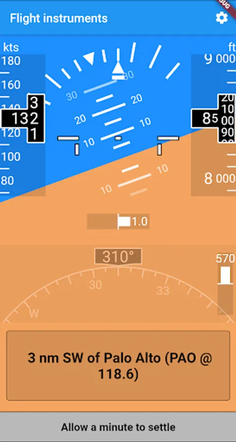 For correct indication, the device needs to be placed vertical, with the screen facing straight back. Level the attitude indicator by tapping the center at any time.